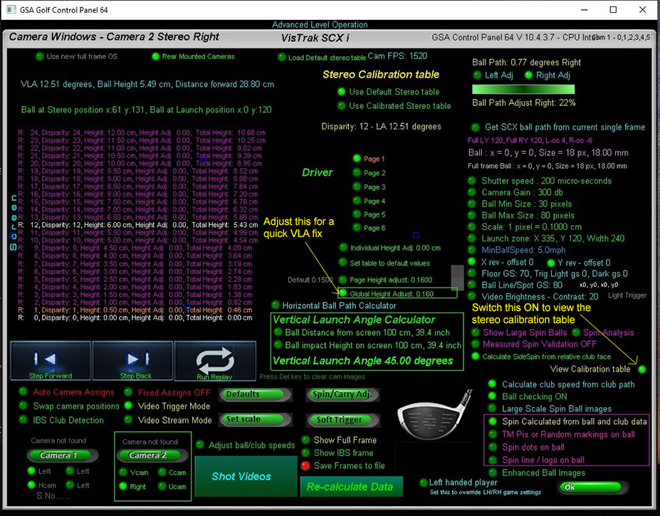 For a quick VLA adjustment, go to the camera panel and switch the "View Calibration table" option ON